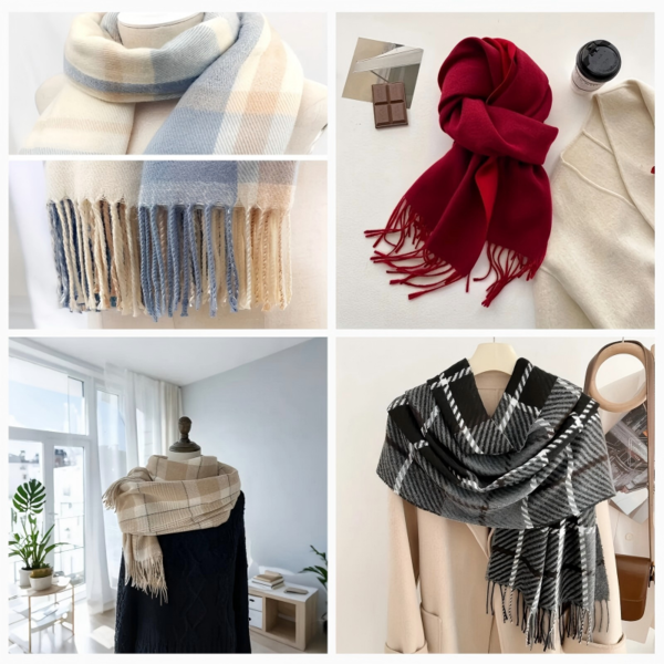 Wholesale of 2 Pcs Elegant Striped Scarf for Women with Tassels, 3 Pcs Elegant French Vintage Inspired Scarf, 4 Pcs Plaid Scarf Shawl for Women, 3 Pcs Elegant Checkered Shawl Scarf for Women and 1 Pc Elegant Winter Plaid Scarf with Tassels.